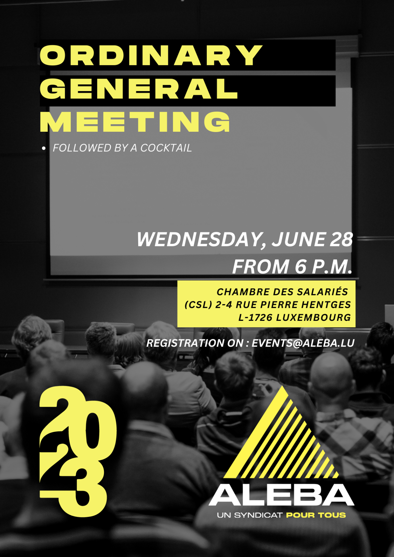 ALEBA is pleased to invite you to its Ordinary General Assembly on Wednesday, June 28, 2023 from 6 p.m. in the Chamber of Employees, 2-4 rue Pierre Hentges L-1726 Luxembourg.
